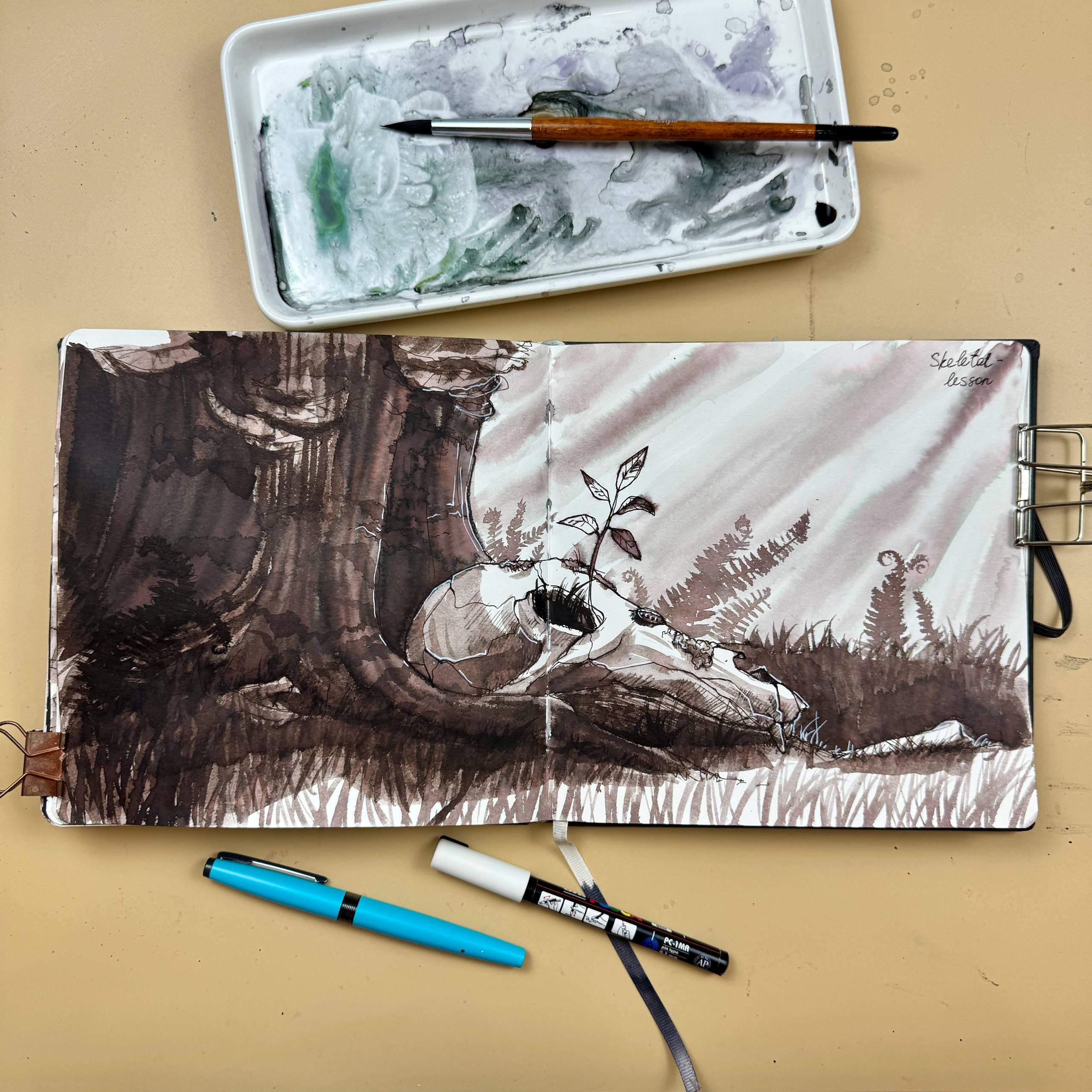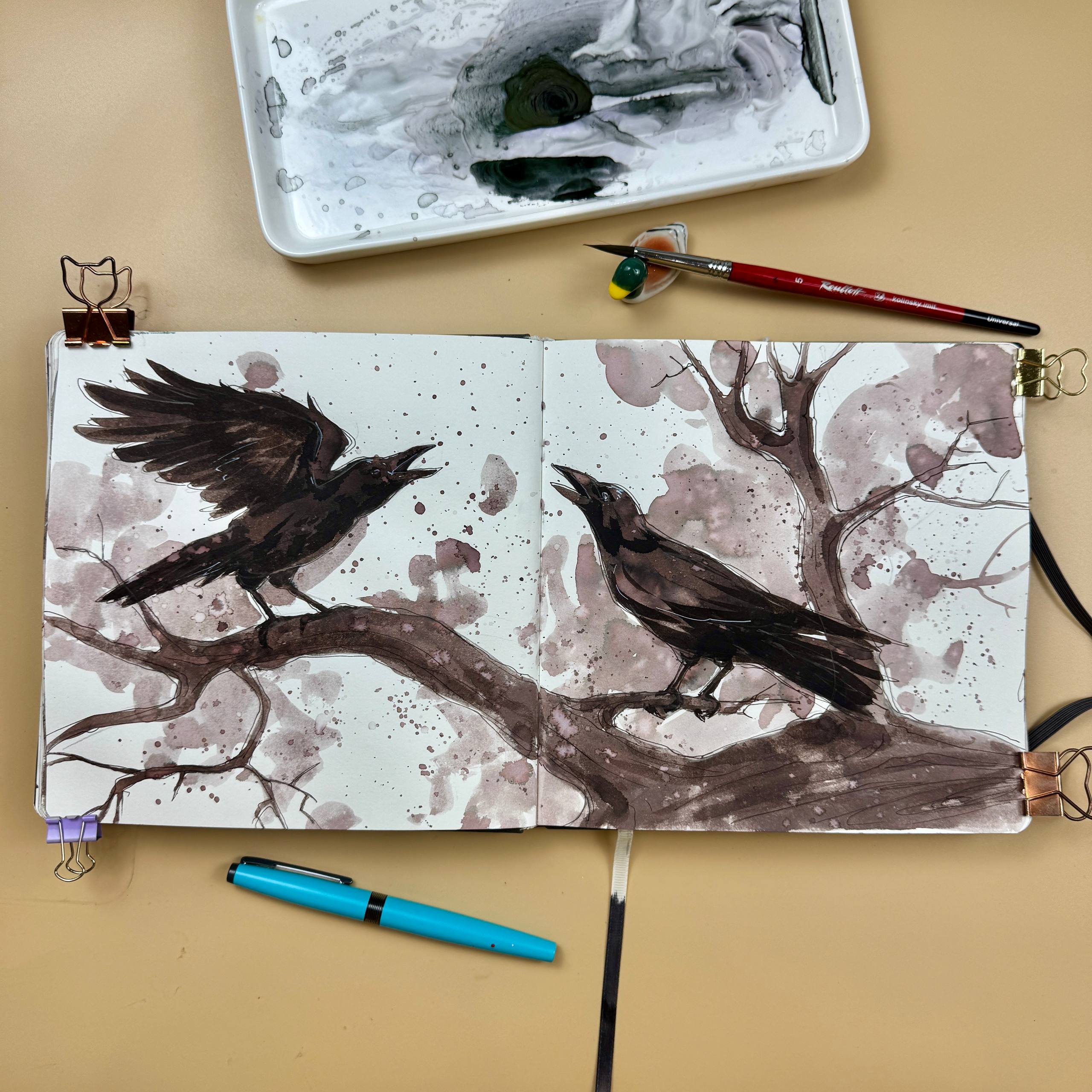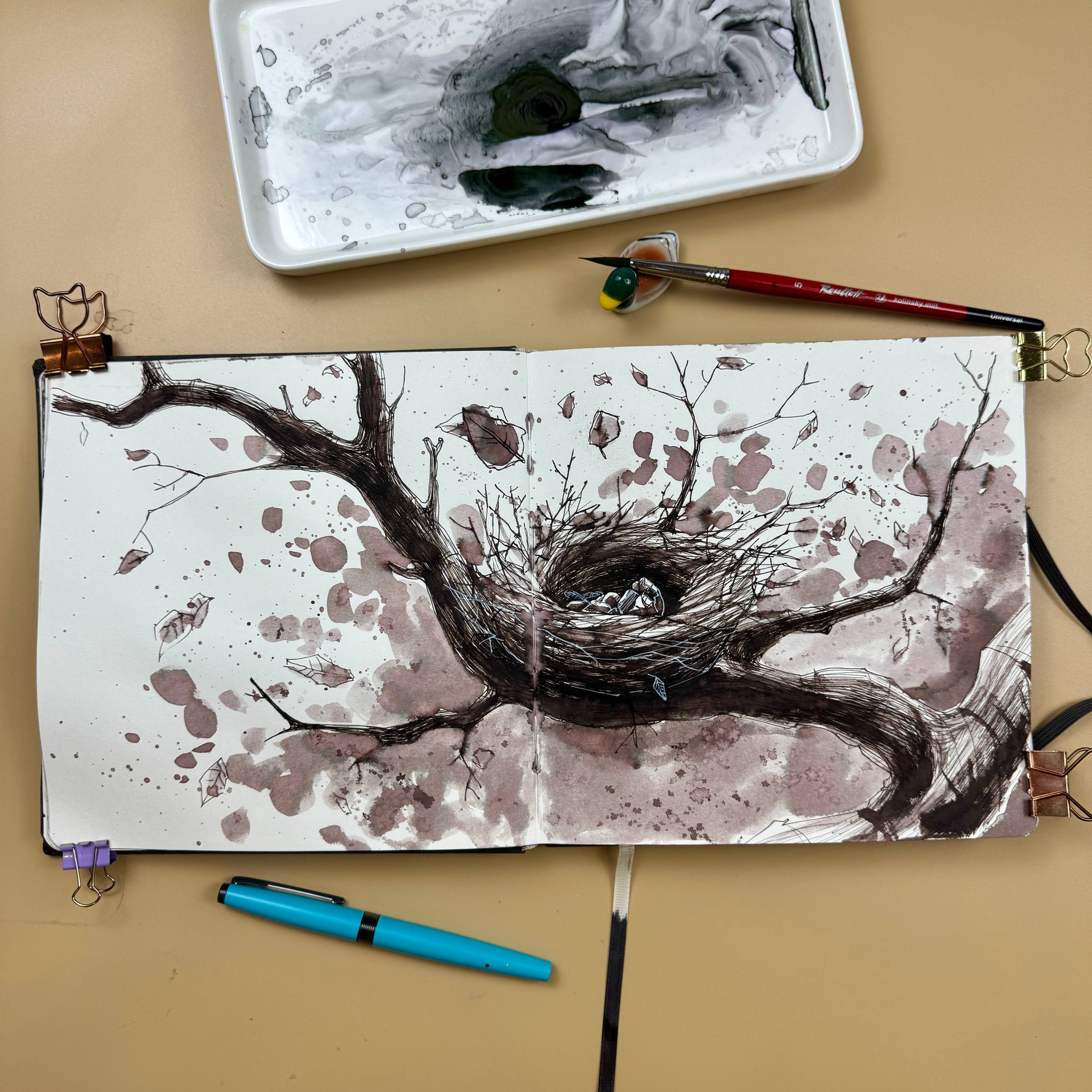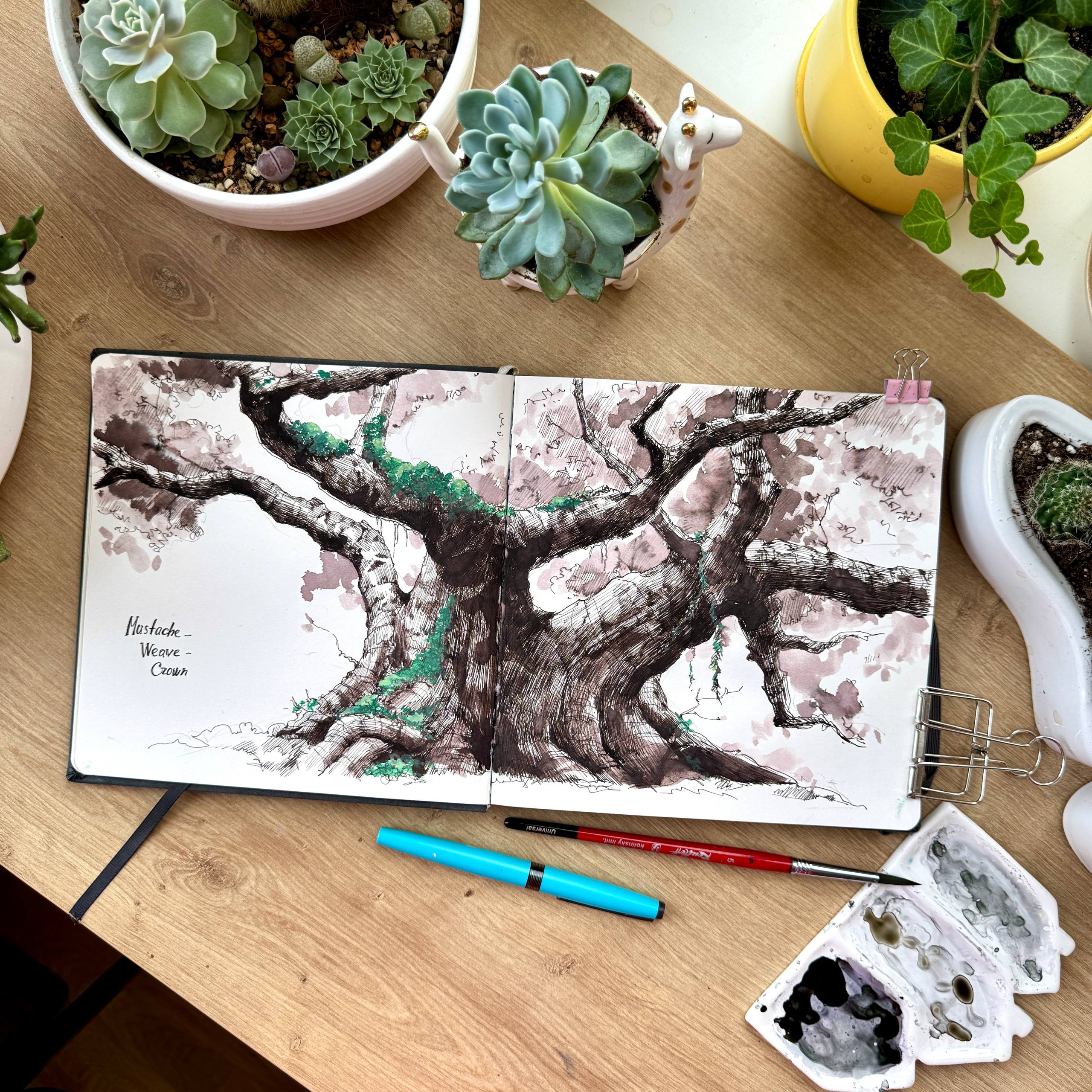 Каждый разворот скетчбука — отдельная история: от мха на дубе до шторма у скал, от полёта птиц до хрупких цветов. Мы будем рисовать в технике гризайль, работать только со светом и тенью, создавая атмосферный арт-скетчбук в духе Inktober.