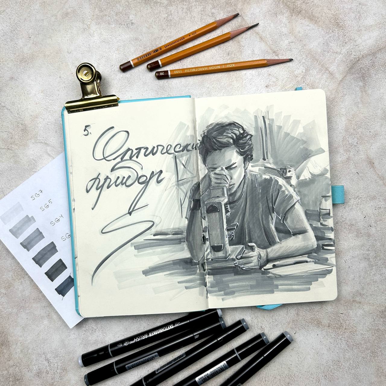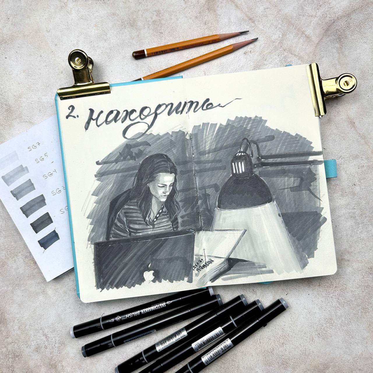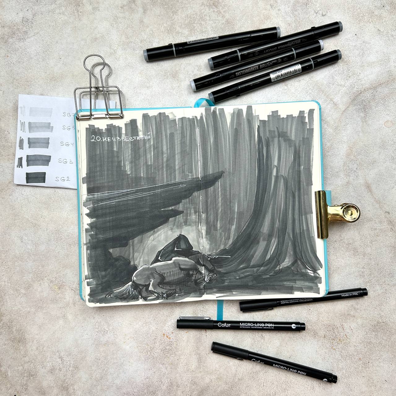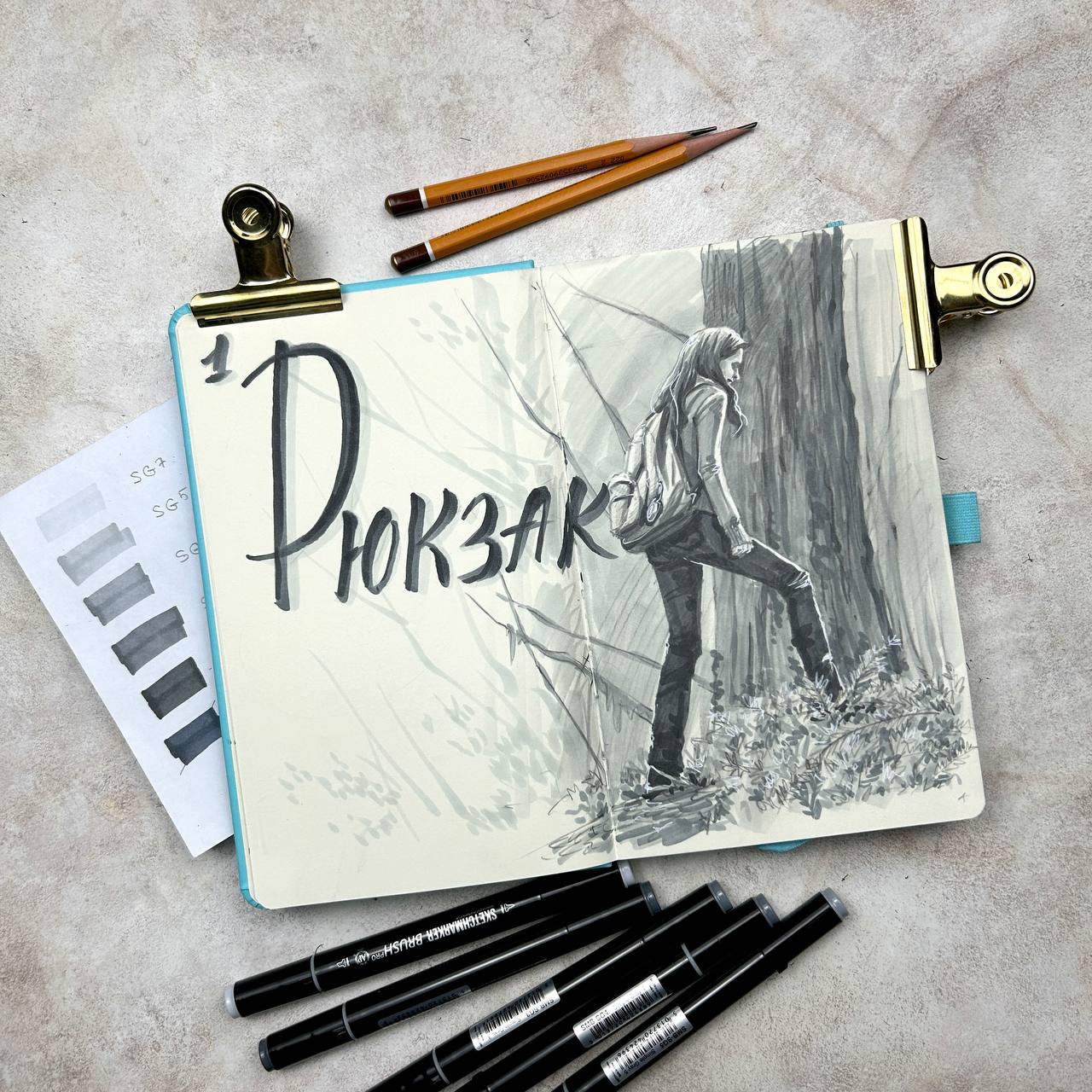 В первую неделю Инктобера используем: простые карандаши, спиртовые маркеры (градиент серого), линеры
