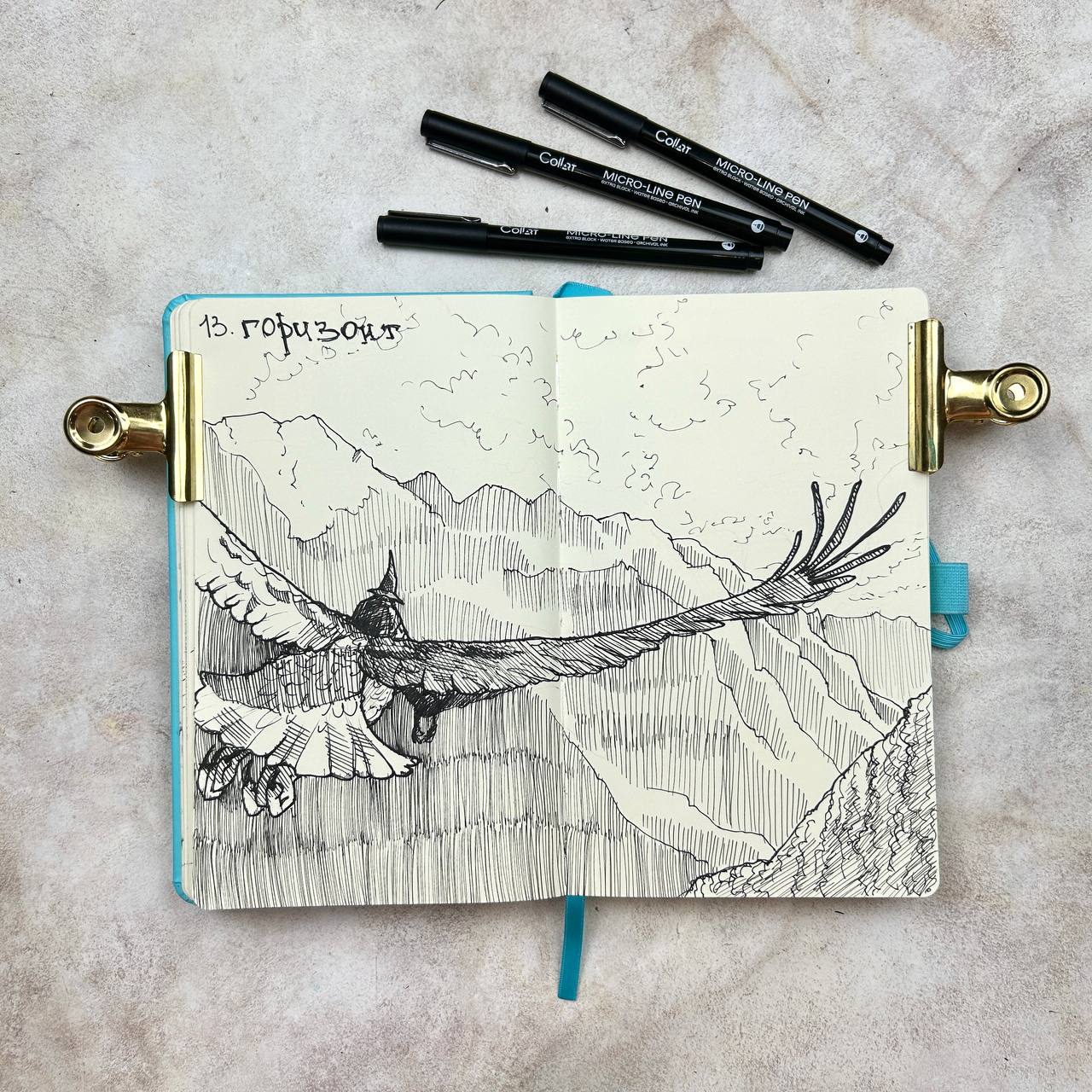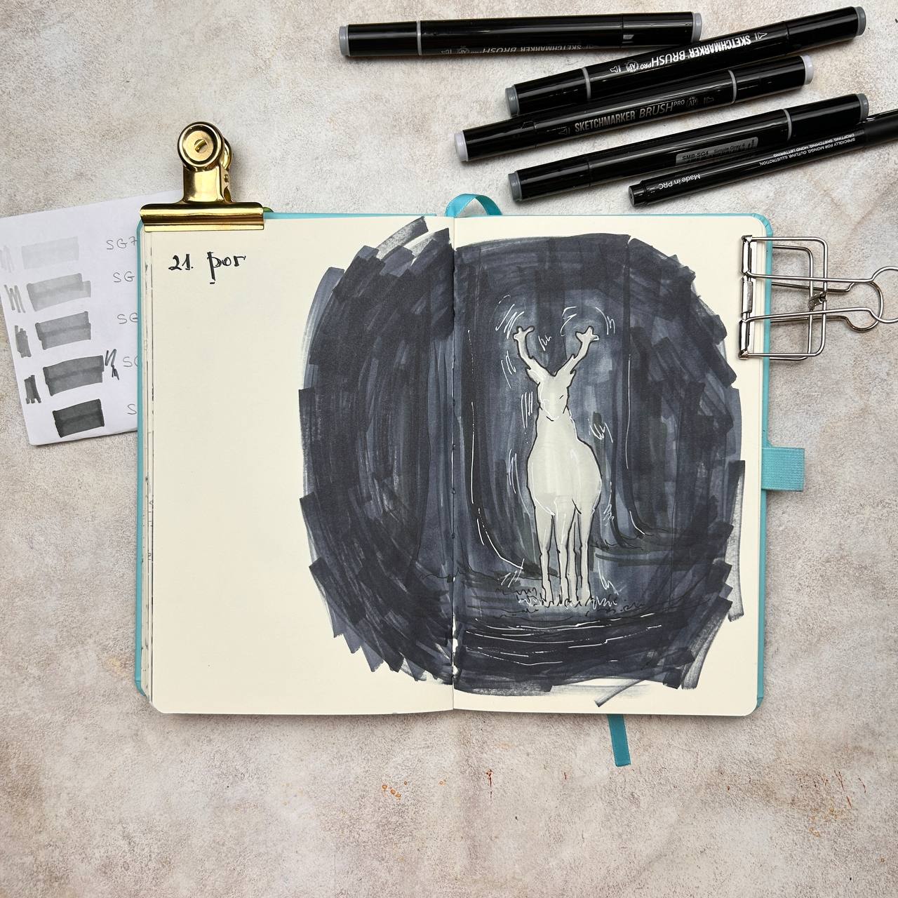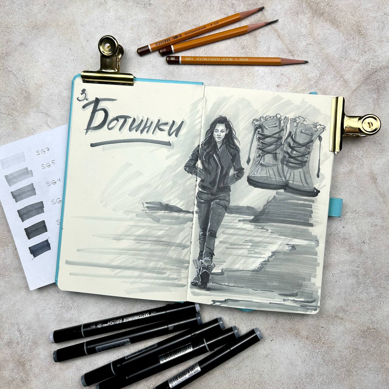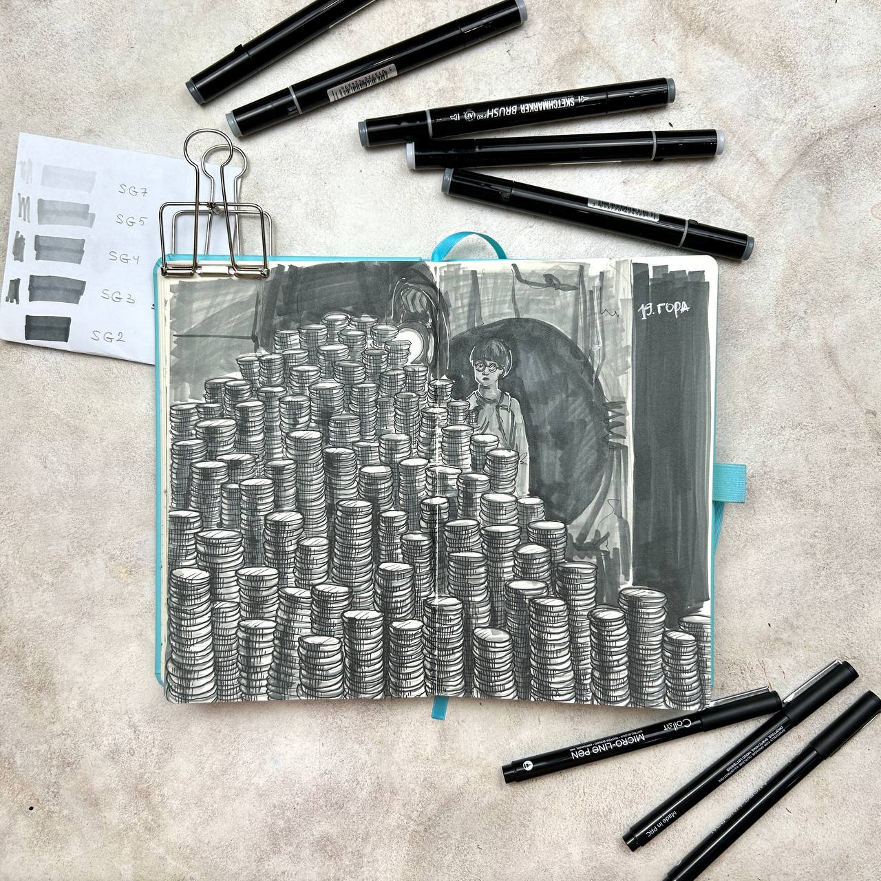 ✓ Используем расширенный список материалов, оставаясь в общем стиле монохромного октября (например, в первую неделю возьмем маркеры, чтобы получить прекрасные серые градиенты, также вас ждут любимые скетчи с линерами)