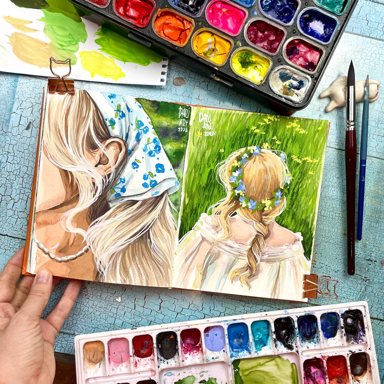 - рисуем девушку в венке, строим женскую фигуру со спины, работаем с волосами, складками ткани, добавляем выразительности с помощью ярких элементов