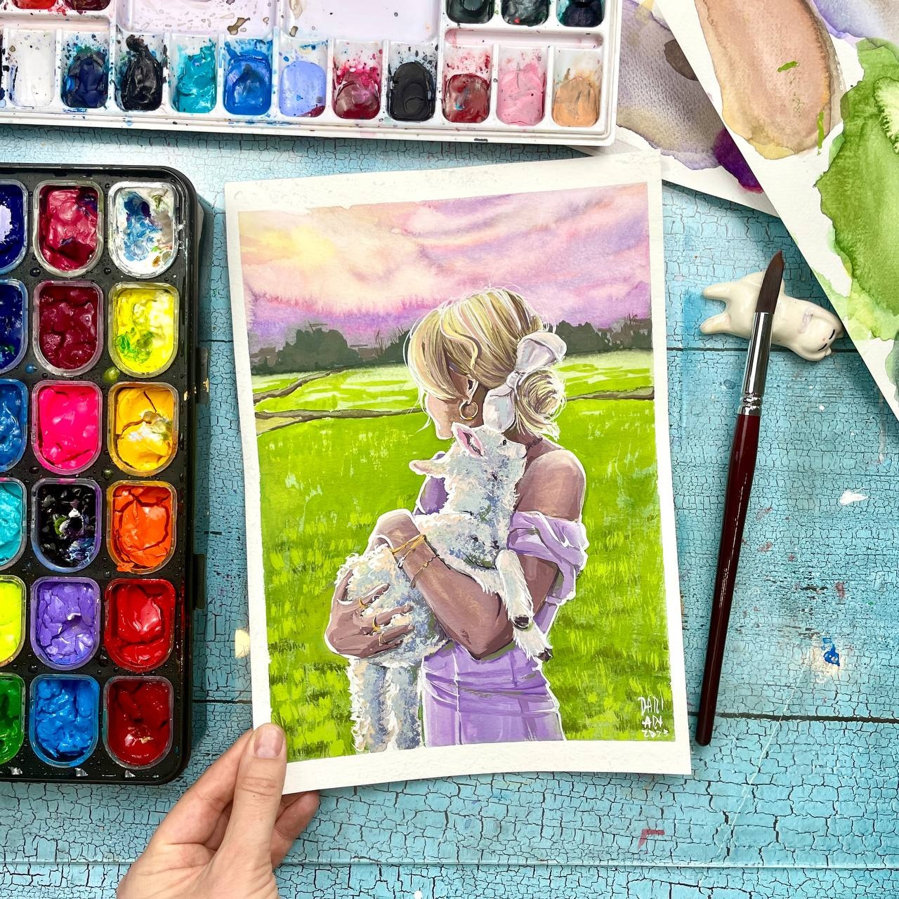 - рисуем девушку с ягненком, создаем красивый пейзаж с нежной цветовой схемой