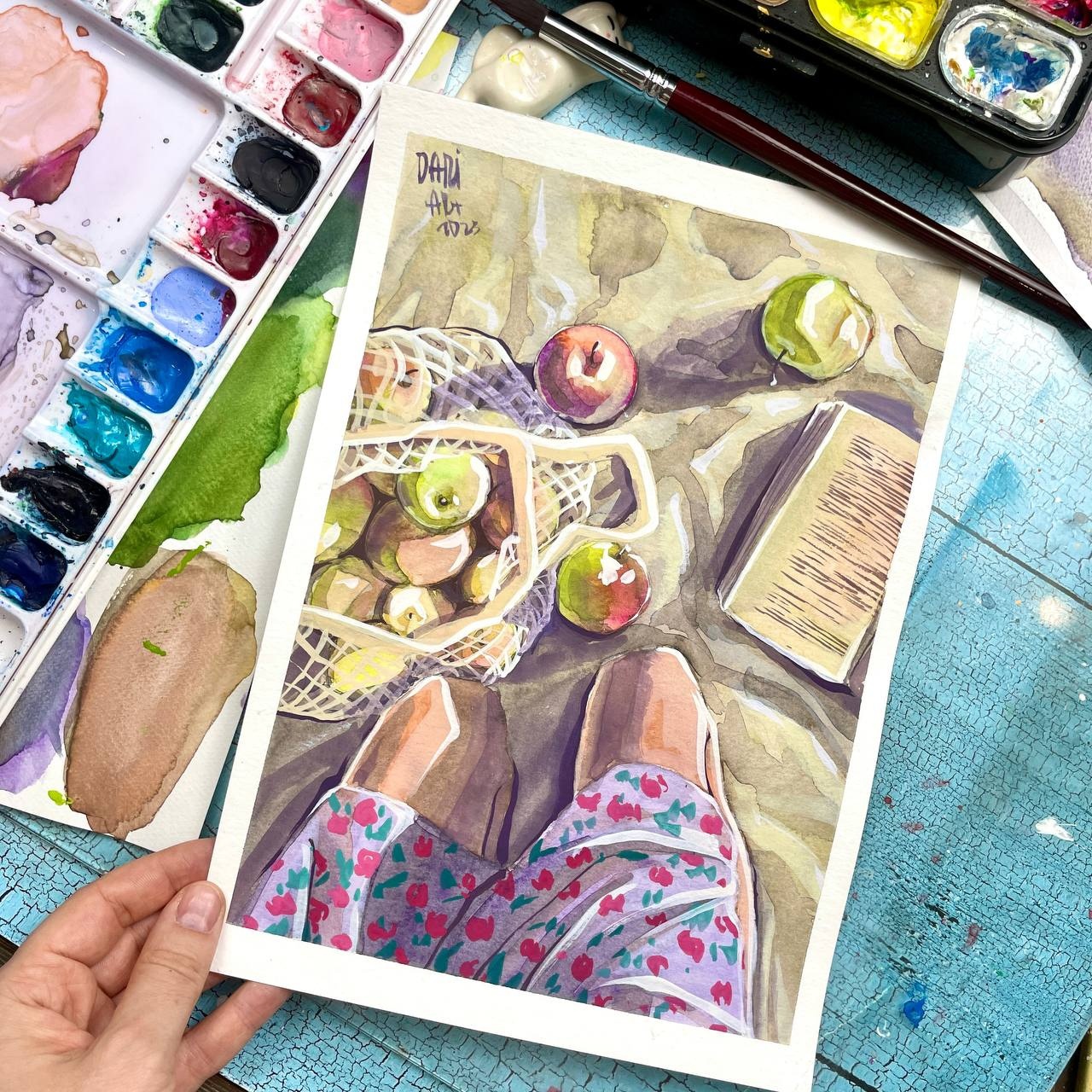 - рисуем необычный сюжет с яблоками и ножками, делаем рисунок особенно интересным с помощью смешанной техники