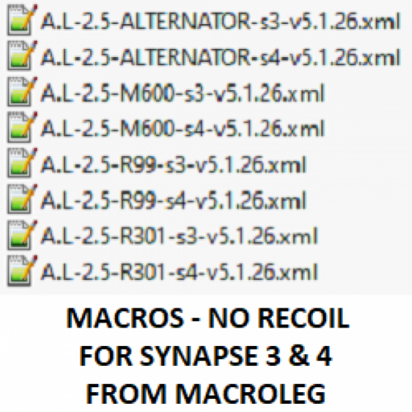 The "No recoil" macros for Razer mice in the game Apex Legends for Alternator, M600, R301, R99, almost completely eliminate recoil. Your mouse must be supported by Synapse 3 or Synapse 4 software.