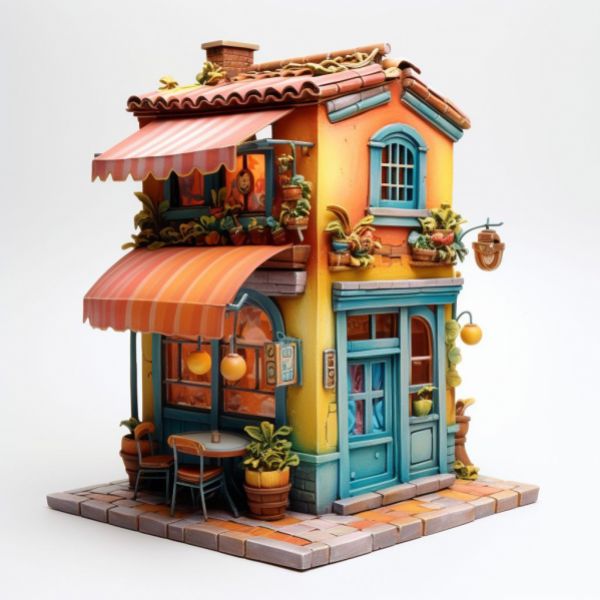 ✓ Фактуры: черепица, тротуарная плитка, оштукатуренная стена, остекленные рамы окон и дверей, тканевые навесы, кирпичная труба