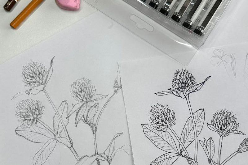 Июнь. Уроки по основам ботанического рисунка карандашом и линером. Выходим на первую натуру. Учимся красиво компонавать цветы на листе. Осваиваем работу с фоном, добавляем акварель Наша учебная натура: клевер, ландыш, вьюнок, ромашка, василёк